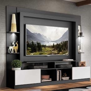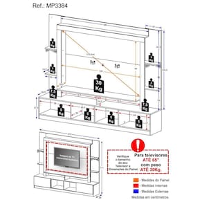 Dimensões do produto montado: Altura: 171cm | Largura: 213cm | Profundidade: 38cm Painel - Altura: 98cm | Largura: 150cm *Devido as variações de tamanho dos televisores no mercado, sugerimos que verifique as medidas da sua TV e compare com o painel antes de efetuar a compra. *Não recomendamos utilizar suporte de TV articulado. *Você pode consultar as medidas internas na imagem técnica do produto.