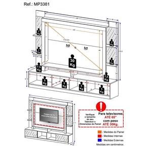 Dimensões do produto montado: Altura: 171cm | Largura: 213cm | Profundidade: 38cm Painel - Altura: 98cm | Largura: 150cm *Devido as variações de tamanho dos televisores no mercado, sugerimos que verifique as medidas da sua TV e compare com o painel antes de efetuar a compra. *Você pode consultar as medidas internas na imagem técnica do produto.