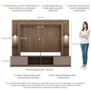 Dimensões do produto montado: Altura: 171cm | Largura: 213cm | Profundidade: 38cm Painel - Altura: 98cm | Largura: 150cm *Devido as variações de tamanho dos televisores no mercado, sugerimos que verifique as medidas da sua TV e compare com o painel antes de efetuar a compra. *Não recomendamos utilizar suporte de TV articulado. *Você pode consultar as medidas internas na imagem técnica do produto.