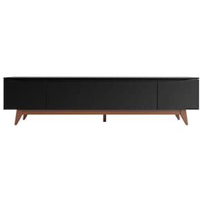 Descrição: O Rack Flynt é ideal para TVs de até 75", combinando funcionalidade e estilo. Fabricado em MDF e MDP com acabamento UV, oferece portas com puxadores cava e pés de madeira Tauari. O tampo espaçoso permite a disposição de eletrônicos e objetos decorativos, enquanto o design clean se adapta a diversos ambientes. O pistão a gás facilita o uso das portas basculantes, garantindo praticidade.