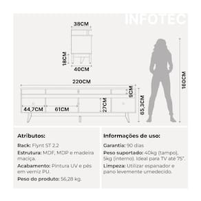 O Rack Flynt ST é a escolha ideal para quem busca funcionalidade e estilo moderno. Com 220 cm de largura, oferece amplo espaço para organizar aparelhos eletrônicos e acomodar TVs de até 75 polegadas. Feito em MDF e com pés altos em madeira Tauari com acabamento em verniz, possui portas laterais com puxadores usinados proporcionando praticidade e elegância.