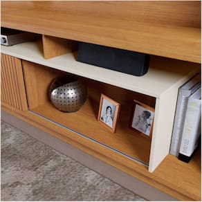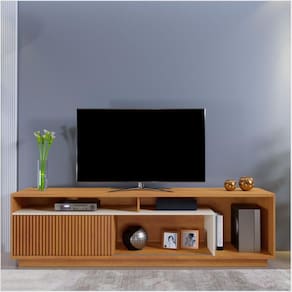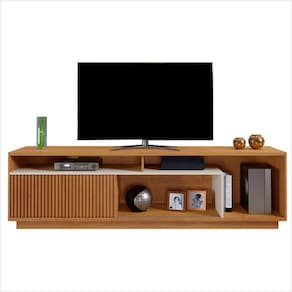 Mesclando o tom amadeirado com a cor off white, o rack Granada tem um visual belíssimo. Fácil de combinar com a decoração, ele possui vários nichos para acomodar eletrônicos, além de porta com detalhe ripado.