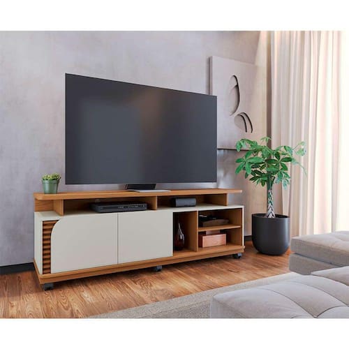 que tal o rack jurerê? o rack jurerê é perfeito para você que busca um móvel funcional para compor a sala de estar ou o home cinema. com design que se inspira nas tendências contemporâneas, este móvel une linhas retas e arredondadas, cor neutra e acabamento amadeirado, tudo para embelezar seu cantinho. já o amplo tampo é ideal para sua tv ou decorações, enquanto os nichos e as portas podem te ajudar na organização de pequenos itens. lindo de verdade, né? Marca: Modern