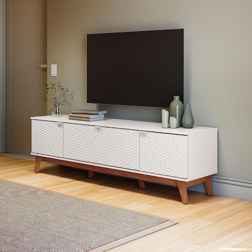O corpo, com pintura na cor branca e acabamento brilho, possui superfície lisa, facilitando a limpeza. Já as portas, em MDF e acabamento BP em 18mm, também na cor branca, possuem detalhe em alto-relevo geométrico e amortecimento, completando a beleza do produto. Os puxadores metálicos facilitam o manuseio e garantem estilo à peça. Uma combinação clássica e elegante para todos os espaços e tipo de decoração.