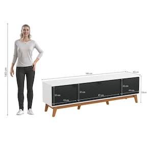 Acabamento: Pintura Touch / Brilho | Cor: Branco/Preto | Dobradiça: Com Amortecimento | Garantia: 3 meses para defeito de fabricação | Matéria-prima: MDF BP / MDP | Peso máximo suportado: 30kg | Puxadores: Metálicos | Quantidade de portas: 3 | Sistema de montagem: Parafuso Philips / Sistema Allen e Minifix | Tipo de porta: Bater | Altura: 52,5cm | Formato do móvel: Rack | Inclui manual de montagem: Sim | Largura: 180 | Profundidade: 42cm | Requer montagem: Sim | Quantidade de caixas de embalagem: 2