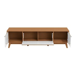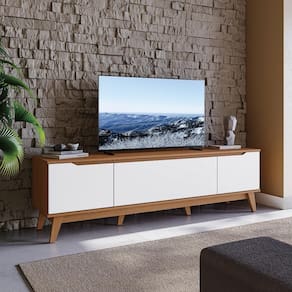Acabamento: Pintura Brilho / Pintura Touch | Cor: Canela/Branco | Dobradiça: Com Amortecimento | Garantia: 3 meses para de fabricação | Matéria-prima: MDF / MDP | Peso máximo suportado: 30kg | Puxadores: Puxador embutido | Quantidade de portas: 3 | Sistema de montagem: Parafuso Philips / Sistema Allen e Minifix | Tipo de porta: Bater | Altura: 52,5 | Largura: 180 | Profundidade: 42 | Quantidade de caixas de embalagem: 2 | Requer montagem: Sim | Formato do móvel: Rack
