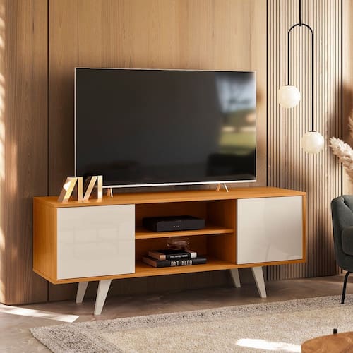 Características: Estrutura em MDP Pintura semi brilho Portas Deslizantes Pés Retrô Espaço para TV até 55 Polegadas.
