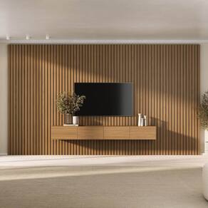 O Rack com painel Aruá traz a essência do estilo japandi, inspirado na simplicidade oriental e no equilíbrio entre forma e função. O rack possui um design baixo com acabamento em Jatobá, ferragens premium, unindo sofisticação e praticidade. Já os painéis são produzidos em chapas de 15mm e oferecem modularidade e personalização do espaço. Versáteis, podem ser utilizados como revestimentos de parede ou painéis de TV, transformando o ambiente com harmonia e elegância. Produto Montado: Sim Acabamento: Finish Foil Acabamento da Porta: Finish Foil Acabamento dos Pés: Finish Foil Altura do Conjunto: 230 cm Altura do Painel: 230 cm Altura do Rack: 31,5 cm Altura dos Pés: 5.5 Altura Máxima dos Pés: 5.5000 Ambiente Principal: Sala de Estar codigo_ean: 7900288310736 Complexidade da Montagem: Média: pode ser montado por mais de uma pessoa e/ou necessite de maior conhecimento para montagem Cor: Jatobá Cor do Produto: Jatobá Escala de Brilho: Semi-Fosco Escala de Brilho da Porta: Semi-Fosco Espessura do Painel: 4,5 cm Espessura do Tampo: 15 mm Fixação na Parede: Sim Itens Inclusos: Painel com Rack, Manual de Montagem e Kit Ferragens Largura do Conjunto: 400 cm Largura do Rack: 210 cm Linha ou Coleção: Aruá Manual de Montagem e Instalação: https://product-hub-prd.madeiramadeira.com.br/905014084/documents/fa5c8ceb-40cd-49f0-b3da-e39a2fbd39d33357291342817684860501365.pdf Marca: CabeCasa MadeiraMadeira Material da Porta: MDP Material dos Pés: MDP Material Principal: MDP Montagem Flex: Não Necessita Montagem: Sim Origem do Produto: Nacional Peso do Painel: 178,25 kg Peso do Rack: 31,35 kg Possui Espelho: Não Possui iluminação: Não Possui Passa Cabos: Não Possui Pés: 02 Possui Prateleiras: Não Possui Tomada: Não Possui Vidro: Não Profundidade do Conjunto: 42 cm Profundidade do Rack: 37,5 cm Recomendações de Uso, Manutenção e Limpeza: A limpeza deve ser feita com pano macio, levemente umedecido com água e sabão neutro. Em seguida, passe um pano seco para evitar o acúmulo de umidade. Nunca utilize produtos abrasivos, esponjas de aço, alvejantes, álcool em excesso ou solventes, pois esses produtos podem agredir o acabamento e comprometer sua aparência. Sapatas Niveladoras: Não Sistema de Montagem: Parafusos e cavilhas Suporte de TV Universal Incluso: Não Tipo de Dobradiça/Corrediça da Porta: Metálica Tipo de Porta: Basculante Tipo de Puxador da Porta: Embutido