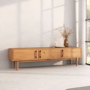 O Rack Madeira Maciça Minimalista Tecca traduz o essencial com personalidade. Feito inteiramente em madeira maciça com acabamento natural Freijó, ele realça os veios e as nuances únicas da madeira, reforçando a beleza do que é simples, bem-feito e duradouro. Seu visual limpo e funcional abriga três portas com puxadores verticais também em madeira, criando um ritmo visual orgânico e discreto.