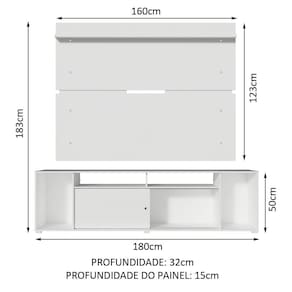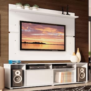 O painel comporta TV de até 65 polegadas e conta com abertura para passar os fios. Contempla também uma prateleira na parte superior, perfeita para objetos decorativos. Por ser separado do rack, pode ser fixado na altura desejada.