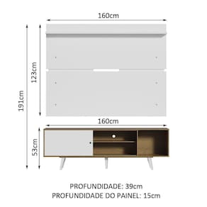 O acabamento do rack combina os tons branco e amadeirado Rustic. O painel é branco. O processo é feito em Pintura Poliéster ecológica com 7 camadas, detalhe que confere maior durabilidade e qualidade.