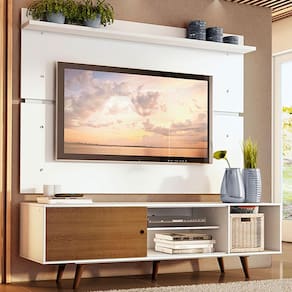O painel comporta TV de até 65 polegadas e contempla uma prateleira na parte superior, perfeita para objetos decorativos. Por ser separado do rack, pode ser fixado na altura desejada.