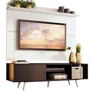 O painel comporta TV de até 65 polegadas e contempla uma prateleira na parte superior, perfeita para objetos decorativos. Por ser separado do rack, pode ser fixado na altura desejada.