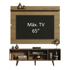 O painel comporta TV de até 65 polegadas e contempla uma prateleira na parte superior, perfeita para objetos decorativos. Por ser separado do rack, pode ser fixado na altura desejada.