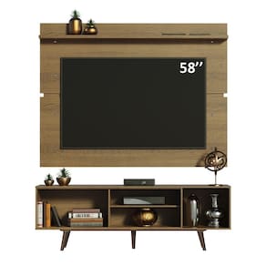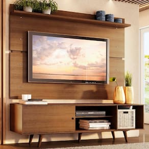 O painel comporta TV de até 65 polegadas e contempla uma prateleira na parte superior, perfeita para objetos decorativos. Por ser separado do rack, pode ser fixado na altura desejada.