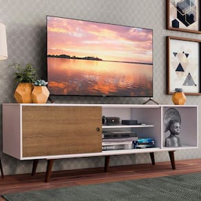 Desenvolvido com base em tendências contemporâneas de design, possui uma distribuição muito bem pensada: são quatro nichos de tamanhos variados e uma porta de correr. Assim, você tem espaço para decoração, aparelhos eletrônicos, livros e muito mais.
