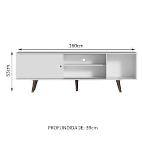 O acabamento do rack é branco e os pés são no padrão amadeirado Rustic. O processo é feito em Poliéster Protetor com 7 camadas, detalhe que confere mais durabilidade e qualidade aos produtos. Além disso, é ecológico, isento de vapores prejudiciais à atmosfera.