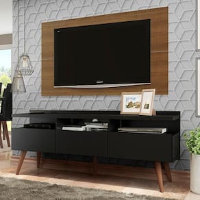 O acabamento do Rack é preto e o do Painel é no padrão amadeirado Rustic. O processo é feito em Pintura Poliéster de alta resistência, que consiste na aplicação de 7 camadas de proteção resistentes a álcool, água e calor. A pintura é ecológica, isenta de vapores que vão para a atmosfera.