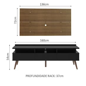 Itens inclusos: - Um (1) Rack com 55 cm de altura x 160 cm de largura x 37 cm de profundidade. - Um (1) Painel para TV: 72 cm de altura x 136 cm de largura. (Não acompanha suporte para fixação da TV.)