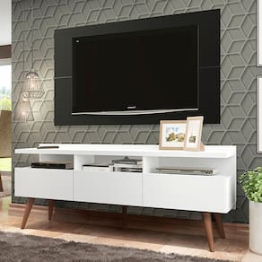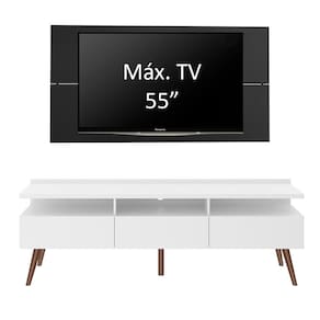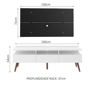Itens inclusos: - Um (1) Rack com 55 cm de altura x 160 cm de largura x 37 cm de profundidade. - Um (1) Painel para TV: 72 cm de altura x 136 cm de largura. (Não acompanha suporte para fixação da TV.)