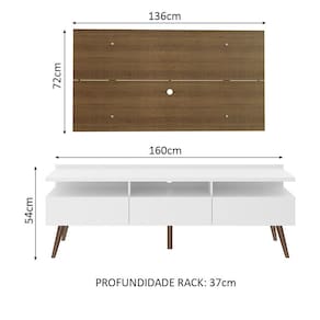 Itens inclusos: - Um (1) Rack com 55 cm de altura x 160 cm de largura x 37 cm de profundidade. - Um (1) Painel para TV: 72 cm de altura x 136 cm de largura. (Não acompanha suporte para fixação da TV.)