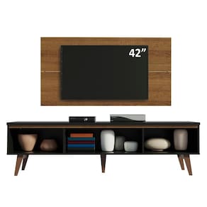 O acabamento do rack é preto com detalhes em amadeirado Rustic e o painel é todo em pintura no padrão amadeirado Rustic. O processo é feito em Pintura Poliéster com 7 camadas de proteção, resistente a álcool, água e calor. Além de ser um processo ecológico, isento de vapores que vão para a atmosfera.