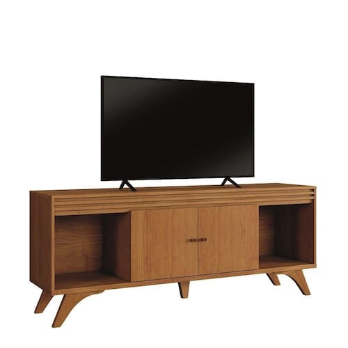 O Rack Madrid é uma opção linda e super versátil que traz 2 portas detalhe ripado. Seu amplo espaço no tampo é ideal para uma TV de até 75 polegadas, permitindo ainda que você deixe sempre à mão os itens necessários a sua rotina e os decorativos que vão agregar ainda mais charme ao produto. O grande espaço interno é perfeito para garantir a organização do ambiente e guardar tudo o que precisa, sem bagunças na sua sala. Seu design se destaca por sua beleza e traz um estilo rústico e moderno para o seu lar.