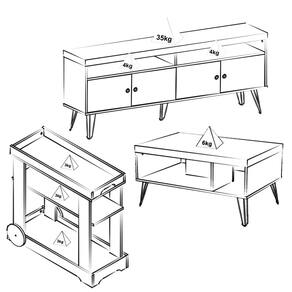 Características adicionais: Rack: Tampo em Tamburato de 50mm que suporta TVs até 65 polegadas, 2 passa fios, 4 portas com dobradiças metálicas, Amplo espaço para objeto e eletrônicos, 5 pés metálicos; Carrinho de Bar: Detalhe usinado, fita de borda metalizada, amplo espaço para bebidas, copos e acessórios, Rodas estilizadas em MDF, 4 rodízios.