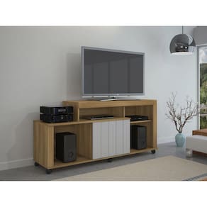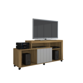Material e estrutura: MDP 15mm, Espaço para eletrônicos, Porta em MDF com frisos detalhe, Rodízios aparentes, Produto compacto Espaço para TV: 1200mm x Livre (LxA), Recomenda-se TV até 43 Possui espaço para objetos decorativos: Sim Prazo de garantia: 90 dias contra defeitos de fabricação Quantidade de volumes: 1 volume Produto desmontado (necessita de montagem): Sim Complexidade de montagem: Fácil