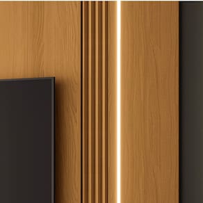 Observações: Desing imponente projetado para TV de até 85” fixada no painel; Iluminação com perfil de LED e apliques canelados nas laterais; Portas de correr com detalhes canelados e trilho em alumínio; Cantos arredondados; Produzido em MDP e MDF com espessura de 15mm;