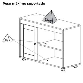 Peso máximo suportado: 39 kg (tampo 35 kg, prateleiras 2 kg cada)