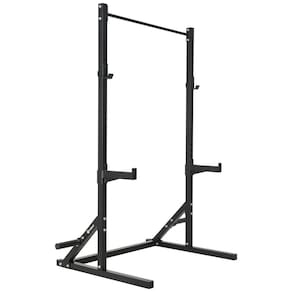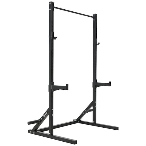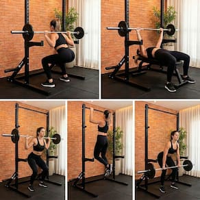 Indispensável para o seu treino: inclui 2 colunas de 2,36 m, 2 suportes para barra olímpica (j-hooks), 1 suporte para pull-up, 1 travessa superior, 2 travessas de base com acabamento emborrachado e kit de parafusos.