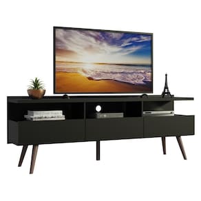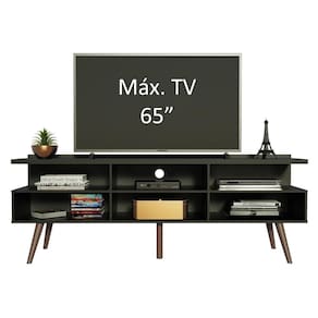 Comporta de até 65 polegadas e possui três portas e nichos para acomodar todos os aparelhos eletrônicos. Seu pé retrô é feito em madeira maciça, material que confere mais firmeza e resistência.