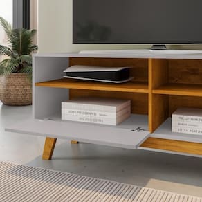 Além de ser produzido em MDP, o Rack possui 1 Porta Basculante com Dobradiças Metálicas e Puxador em MDF Revestido, 3 amplos Nichos e Pés em Madeira Maciça.