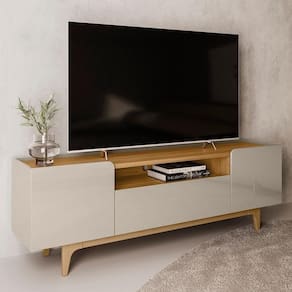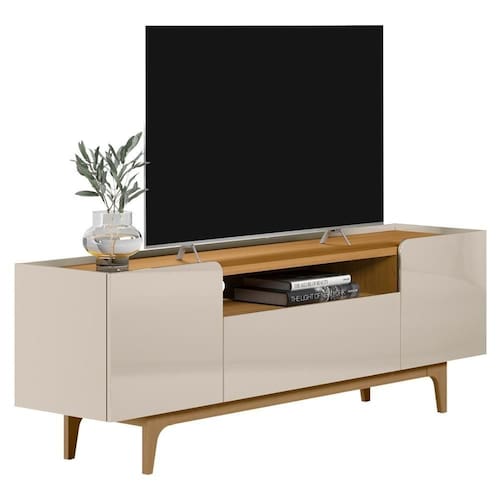 Com amplo espaço sobre a bancada e pés de madeira maciça, esse rack para oferece funcionalidade excepcional e um toque de elegância ao seu ambiente. O design impecável, com linhas minimalistas eleva o estilo da sua sala de estar a um patamar superior. Sobre a bancada de é possível dispor aparelhos de até 75 polegadas, enquanto os compartimentos internos das três portas são ótimos para guardar diversos itens com facilidade de acesso. Já o charme fica por conta do puxador passante, que nada mais é que um rebaixo da caixaria principal para que as portas possam se apoiar sobre ele, ficando muito mais elegantes e clean. Para completar, o nicho central permite uma instalação prática dos demais aparelhos eletrônicos, e sem bagunça de fios. Demais não é mesmo?!