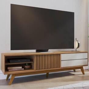 O design com cinco pés de madeira maciça e travas em MDF oferece tanto estabilidade, quanto elegância para a sua sala de estar. Por outro lado, as duas gavetas com corrediças telescópicas garantem praticidade, enquanto a porta deslizante ripada confere um toque de textura ao móvel. Já a prateleira é ideal para organizar seus aparelhos eletrônicos ou até mesmo objetos decorativos. Para completar a lista de atributos, a base e o tampo de 25mm garantem robustez e durabilidade, tornando essa bancada um investimento de longo prazo, além de comportar TVs de até 75 polegadas.