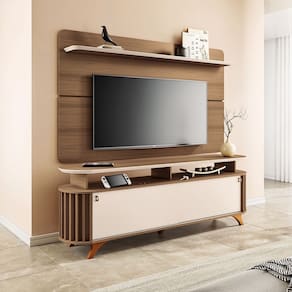 O Rack para Sala Bancada de TV 70 Pol 181,5cm Riley Castanho/Off White você transformará sua sala de estar em um espaço luxuoso. O estilo orgânico, que remete a formas mais naturais e suaves, é também à inovação do design, criando um visual moderno. A linha fluida e elegante do móvel, combinada com os pés de madeira maciça, trazendo uma sensação de sofisticação e aconchego ao mesmo tempo. A capacidade de receber TVs de até 70 polegadas garante que você tenha espaço de sobra para um entretenimento de qualidade. As duas portas são super funcionais, permitindo fácil acesso ao amplo compartimento interno, perfeito para guardar itens diversos como controles, DVDs e outros acessórios. Os ripados nas laterais trazem uma textura sofisticada que adiciona um charme único e modernidade ao design, enquanto o tampo chanfrado cria um visual mais elegante e detalhado. Cada pequeno detalhe foi pensado com cuidado para criar um móvel que não só organiza, mas também enriquece a estética do espaço. Garanta já o seu!