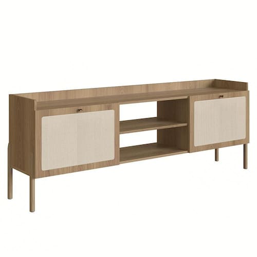 Transforme a sua Sala de Estar em um espaço aconchegante e funcional com o Rack Para Sala Bancada de 70 Pol Pés Madeira Arlo Hanover, da Mpozenato. Com design orgânico e inovador, esse Rack para com pés de madeira maciça promete um visual elegante para sua sala. Além de ter capacidade para receber televisores de até 65 polegadas, essa Bancada Para Sala ainda conta com duas portas, com abertura em 90, dobradiças e freio metálicos com proteção anticorrosão e excelente compartimento interno, ideal para armazenar os mais diversos itens e, assim, deixar o tampo livre de bagunças. Mas além da funcionalidade, esse rack também será o ícone decorativo do seu ambiente; afinal, conta com detalhe em tela sintética fixada nas portas que expressa charme e cuidado. Adicione ao seu carrinho e crie um espaço acolhedor. ESPECIFICAÇÕES Dimensões do ProdutoLargura: 183 cm. Altura: 66 cm. Profundidade: 37,5 cm. Peso: 31,65 Kg. Características do ProdutoMaterial da Estrutura: MDP 15mm/ HDF 25mm. Peso Suportado Distribuído: 40 kg. Acabamento: BP. Escala de Brilho: Fosco. Suporta de até: 65 Polegadas. Possui Prateleiras: Sim.Quantidade de Prateleiras: 1 Prateleira. Possui Portas: Sim. Quantidade de Portas: 4 Portas. Material da Porta: MDF. Tipo de Porta: Basculante. Possui Gavetas: Não. Possui Puxador: Sim. Material do Puxador: Poliestireno. Possui Nicho: Não. Possui Espelho: Não. Possui Pés: Sim. Material dos Pés: Madeira Maciça. Diferenciais:- Design orgânico.- Pés em madeira maciça.- Aplique de Tela Sintética nas portas.- Longarina metálica para evitar empenamento.Sistema de Montagem: Cavilhas/Parafusos/Minifix. Manual de Montagem: Sim. Complexidade da Montagem: Alta. Volumes: 2 Volumes. Conteúdo da Embalagem: 1 Rack. Garantia do Fabricante: 90 dias contra de fabricação. Montagem: Recomendamos que seja feita por um . Recomendação de Limpeza: Utilize pano levemente úmido. Observações importantes:- Produto para uso residencial em ambiente interno, não devendo ficar exposto diretamente ao sol, calor e umidades excessivas.- Pode haver alguma diferença de tonalidade entre a imagem e o produto real, por conta do tratamento de imagens e a calibração de cores do seu monitor.- As imagens são meramente ilustrativas, não acompanham objetos de decoração e eletrônicos.- Ao receber a mercadoria, o cliente deve verificar as condições da embalagem, caso haja alguma não assine o de .- Montagem, desmontagem e outras instalações serão de responsabilidade do cliente. Não nos responsabilizamos, no ato da , por subir escadas/elevadores ou pelo por guincho em apartamentos. Eventuais despesas são de responsabilidade do comprador.- Confira as dimensões do produto e certifique-se de que passará normalmente por supostos elevadores, portas, escadas e/ou corredores de sua residência.