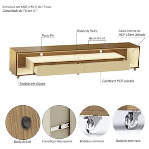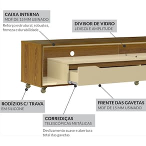 O Rack Led Loop 2200 mm é um produto com um design inovador e com diversidades de materiais, um dos seus diferenciais é um Kit de Neon em Led com luz quente no tampo superior, iluminando todo o Rack, inclusive refletindo esta iluminação em um divisor em vidro, valorizando-o e deixando o ambiente agradável e aconchegante. Nele possui à volta inteira interna peças em MDF com bordas chanfradas, reforçando e valorizando ainda mais o produto. Também apresenta um nicho com duas gavetas em MDF usinadas com pega como puxadores, corrediças telescópicas e passa fio para eletrônicos. Sua estrutura é em MDF e MDP de 15 mm e possui seis rodízios em silicone facilitando para locomoção e limpeza do ambiente. É um produto com design de uma pegada contemporânea onde você personaliza seu ambiente deixando-o exclusivo.
