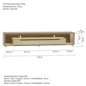 - Acabamento: Pintura UV - Escala de Brilho: Acetinado - Formato do móvel: Rack - Garantia: 3 Meses - Inclui manual de montagem: Sim - Material da Estrutura: MDF e MDP 15 mm - Medida do Produto Montado (LXCXA): 38,8cmX218cmX44cm - Peso do Produto Montado: 43 - Peso Máximo Suportado: 40 - Produto Necessita de Montagem?: Não - Quantidade de Pés: 6 - Recomendações de manutenção: Pano úmido. Não aplicar lustra móveis. - Tamanho Máximo da Tv: Até 70 Polegadas - Tipo de Pés: Rodízio - Volumes: 2 - Tamanho: Médio - Quantidade de Portas: Não possui