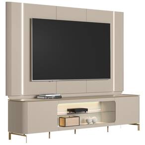 O painel para TV, com seus detalhes curvos canelados, suporta TVs de até 85 polegadas. Já o rack bancada, com tampo em MDF e pés metálicos dourados que evocam o charme industrial, complementa a elegância do ambiente. Os nichos centrais são ideais para organizar aparelhos eletrônicos e itens decorativos, enquanto as fitas de LED nas laterais do painel trazem um toque mágico à sua sala, criando um espaço acolhedor para momentos especiais.