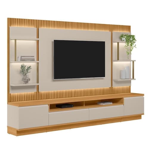 Uma sala de estar digna das telonas pode ser sua! Confira os detalhes do Rack com Painel Para TV 297cm Spencer, da Lyam Decor, e se apaixone!