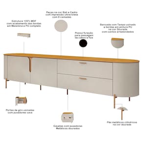 Os contornos suaves e os cantos arredondados do painel e rack não apenas conferem um visual harmônico, mas também garantem que a estética orgânica se destaque em qualquer decoração, trazendo um ar de tranquilidade e beleza natural para sua sala. Já os pés metálicos na cor dourada proporcionam um contraste perfeito, adicionando um elemento de robustez e confere estabilidade ao móvel, ao passo que a tonalidade dourada traz um toque de glamour, que combina com qualquer paleta de cores. Para completar essa experiência visual, o painel para TV conta com iluminação LED que valoriza ainda mais a sua TV, criando uma atmosfera acolhedora, ideal para momentos de lazer e entretenimento com a família e amigos.