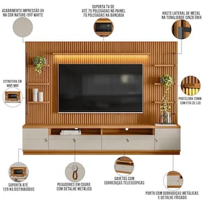 Suporta TV de até 75 polegadas no painel, 70 polegadas na bancada.