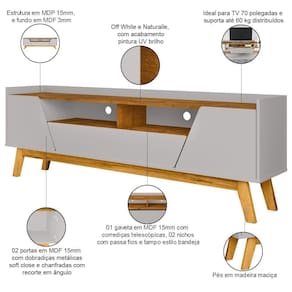 SupplierSimpleName: Rack Para Sala de Estar 70 Pol 180cm Morello B02 Off White Naturalle - Lyam Decor | ProductWidth: 180 cm | ProductInstructions: Produto para uso em ambiente interno, nao devendo ficar exposto ao sol, calor e umidade excessivos. | Formato do móvel: Rack sem Painel | Cor: Off White Naturalle | Altura: 59 cm | Material da estrutura: MDP | Color: OFF WHITE | Largura: 180 cm | Profundidade: 36 cm | ColorFamily: Off White | ColorSimple: Off White | Tamanho máximo de : 70 Polegadas | Quantidade de portas: 2 | ColorSupplier: Off White Naturalle | Quantidade de gavetas: 1 | Requer montagem: Sim | Com compartimento para alto-falantes: Não | Material: MDP | Com rodas: Não | MaterialFamily: MDP | Peso: 31 Kg | Model: Morello | Materiais do corpo: MDP | OriginCountry: | OriginState: PR | ProductWarranty: 90 dias após o do produto | SizeDescription: Altura: 59 cm x Largura: 180 cm x Profundidade: 36 cm | Material das corrediças: Telescópicas | ProductWeight: 31 kg | ProductContents: 01 Rack, manual de montagem, acessórios | ProductLength: 36 cm | ProductHeight: 59 cm