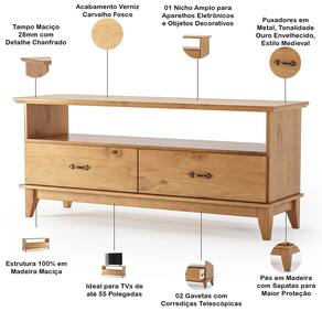 Diferente dos modelos convencionais, esse rack de madeira oferece 02 gavetas práticas para itens menores e um nicho amplo que acomoda até os maiores acessórios de som e vídeo. Além disso, o tampo chanfrado de 28mm em madeira maciça garante estabilidade e resistência, enquanto o acabamento em carvalho fosco e os puxadores medievais criam um ambiente sofisticado e único. Em outras palavras, praticidade e design que se unem para o seu conforto.