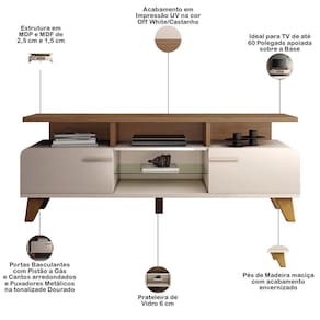 Com um tampo espaçoso, esse rack suporta TVs de até 60 polegadas, tornando-se a base perfeita para suas sessões de cinema em casa e maratonas de séries. Prepare-se para momentos inesquecíveis com a família e amigos, enquanto desfruta de um ambiente acolhedor e elegante. Além disso, oferece soluções práticas para manter sua sala organizada já que com os compartimentos amplos e prateleiras, você pode armazenar seus dispositivos eletrônicos, jogos e acessórios de forma discreta e acessível.