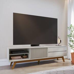 Esse rack de TV combina os designs clássico e moderno expressos pelos detalhes como os pés retrô e a porta ripada, ou seja, uma bancada para sala ideal para você que não abre mão do bom gosto. Mais que somente beleza, esse rack também possui durabilidade e robustez, graças aos pés de madeira maciça com travas em MDF. Já a funcionalidade fica por conta das duas gavetas com corrediças telescópicas que possuem ótimo espaço de armazenamento, bem como dos nichos e prateleira que servem para dispositivos eletrônicos ou itens decorativos.