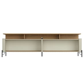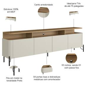 Com pés metálicos no estilo industrial e cantos arredondados que suavizam o ambiente, esse rack industrial móvel é a fusão perfeita entre força e sofisticação. O tampo flutuante cria a sensação de que sua TV 75 polegadas está suspensa, enquanto os nichos estratégicos organizam todos os aparelhos com ventilação ideal. Os espaços internos amplos, discretamente escondidos atrás das portas, são convites para organizar desde coleções até aqueles itens do dia a dia que você quer manter por perto, mas longe da vista.