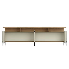Com pés metálicos no estilo industrial e cantos arredondados que suavizam o ambiente, esse rack industrial móvel é a fusão perfeita entre força e sofisticação. O tampo flutuante cria a sensação de que sua TV 75 polegadas está suspensa, enquanto os nichos estratégicos organizam todos os aparelhos com ventilação ideal. Os espaços internos amplos, discretamente escondidos atrás das portas brise, são convites para organizar desde coleções até aqueles itens do dia a dia que você quer manter por perto, mas longe da vista.